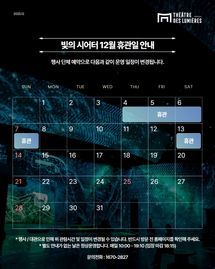 - 관람 시간 : 월~일 10시 ~ 19시 10분 (입장 마감 18시 15분)