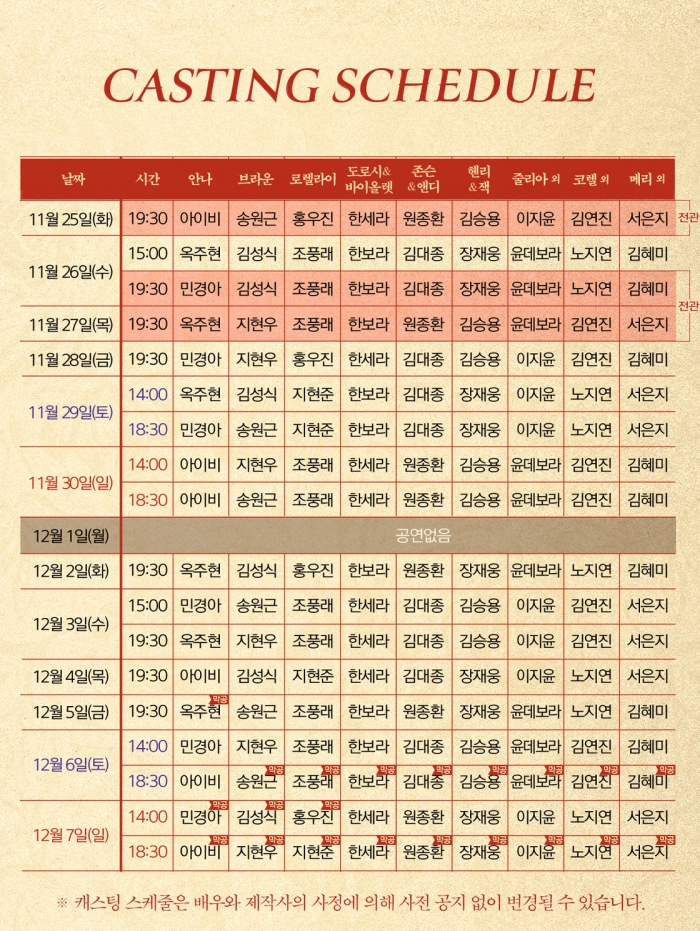 -관람 등급에 부합되지 않는 관람객은 티켓 유무, 보호자의 동반 여부와 관계없이 공연장 입장이 절대 불가합니다. (관람 연령 미만으로 예매 티켓 취소/환불/변경 일체 불가)