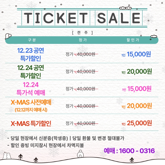 | 유효기간(이용조건) | 2025년12월23일(화) ~ 12월25일(목) (예매한 공연일시에 한해 이용 가능) | ||||||||