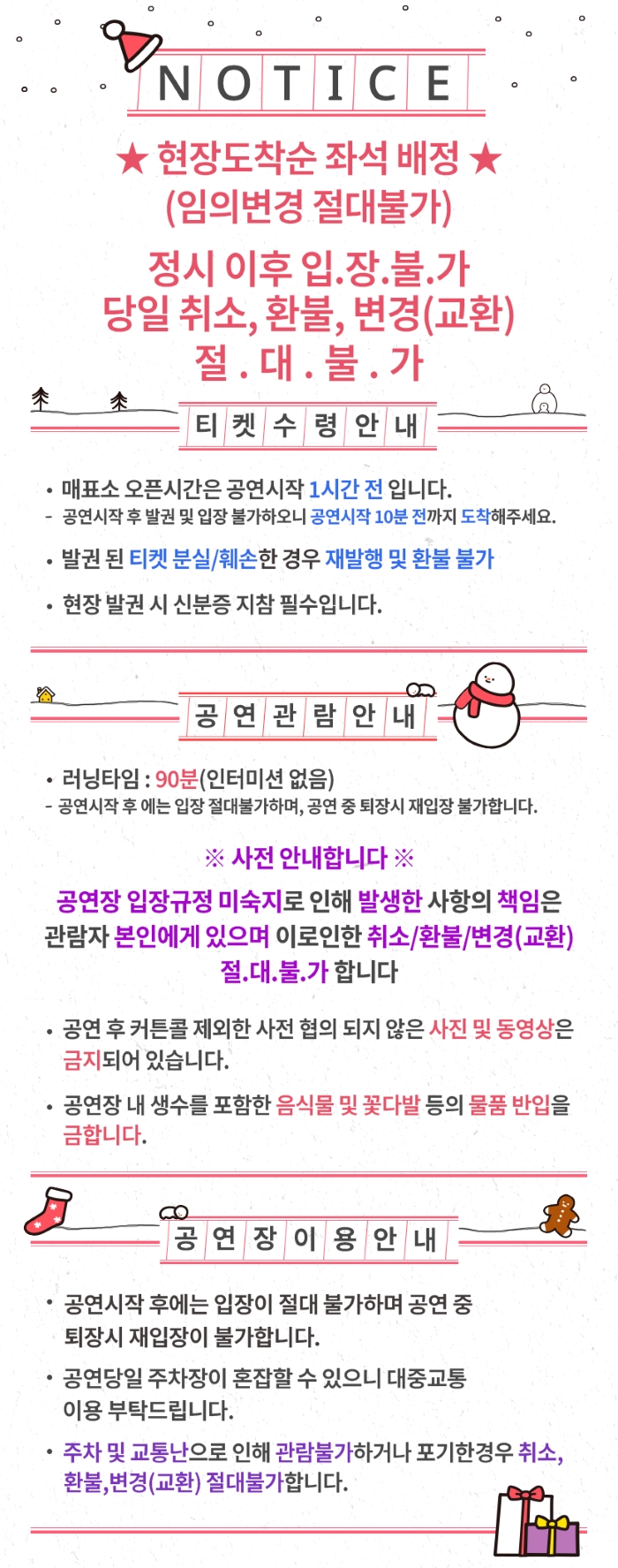 ∙ 취소마감시간 : 공연일 1일 전 오후 5시 / 공연일이 일요일, 월요일인 경우 토요일 낮 12시